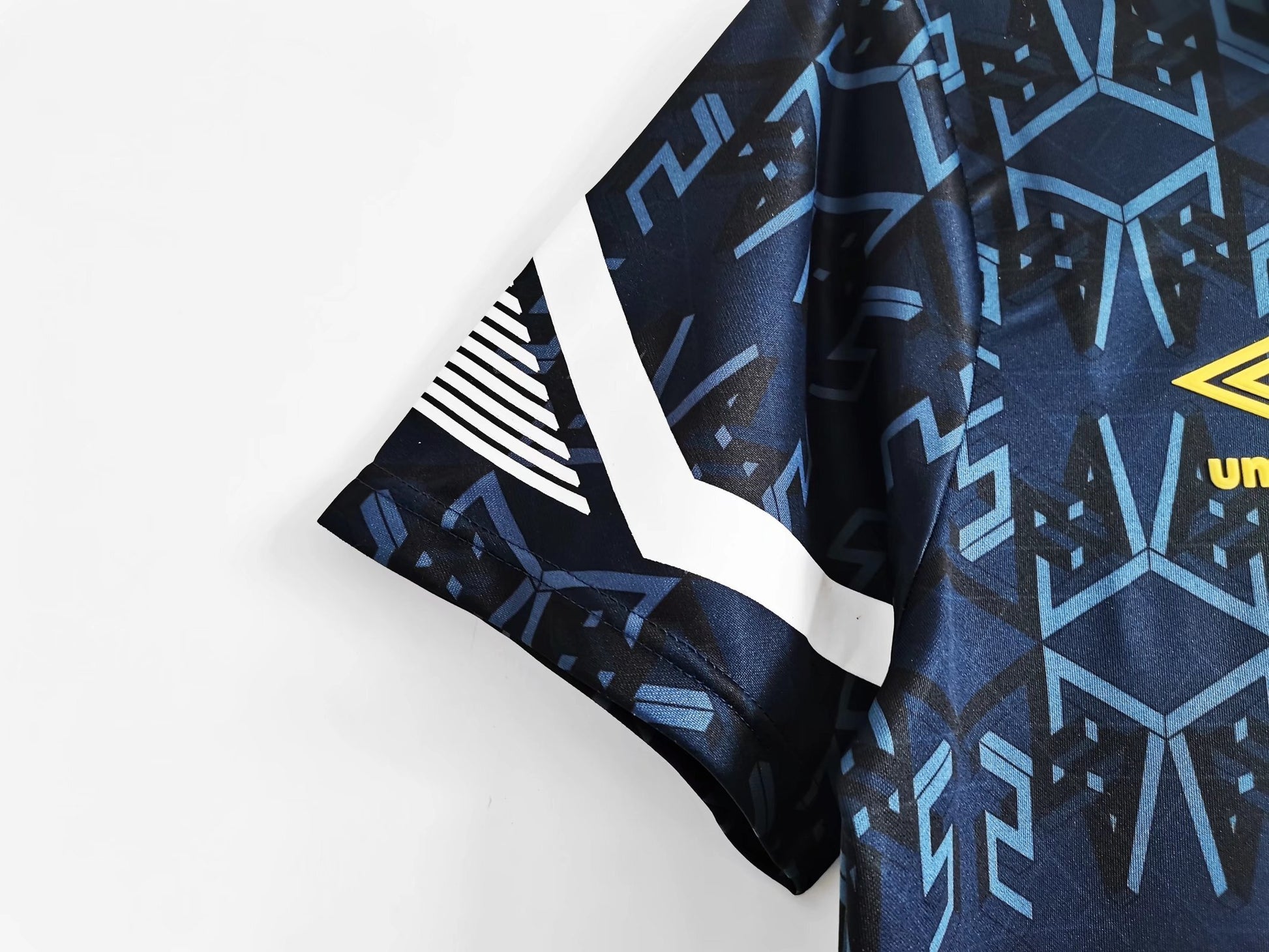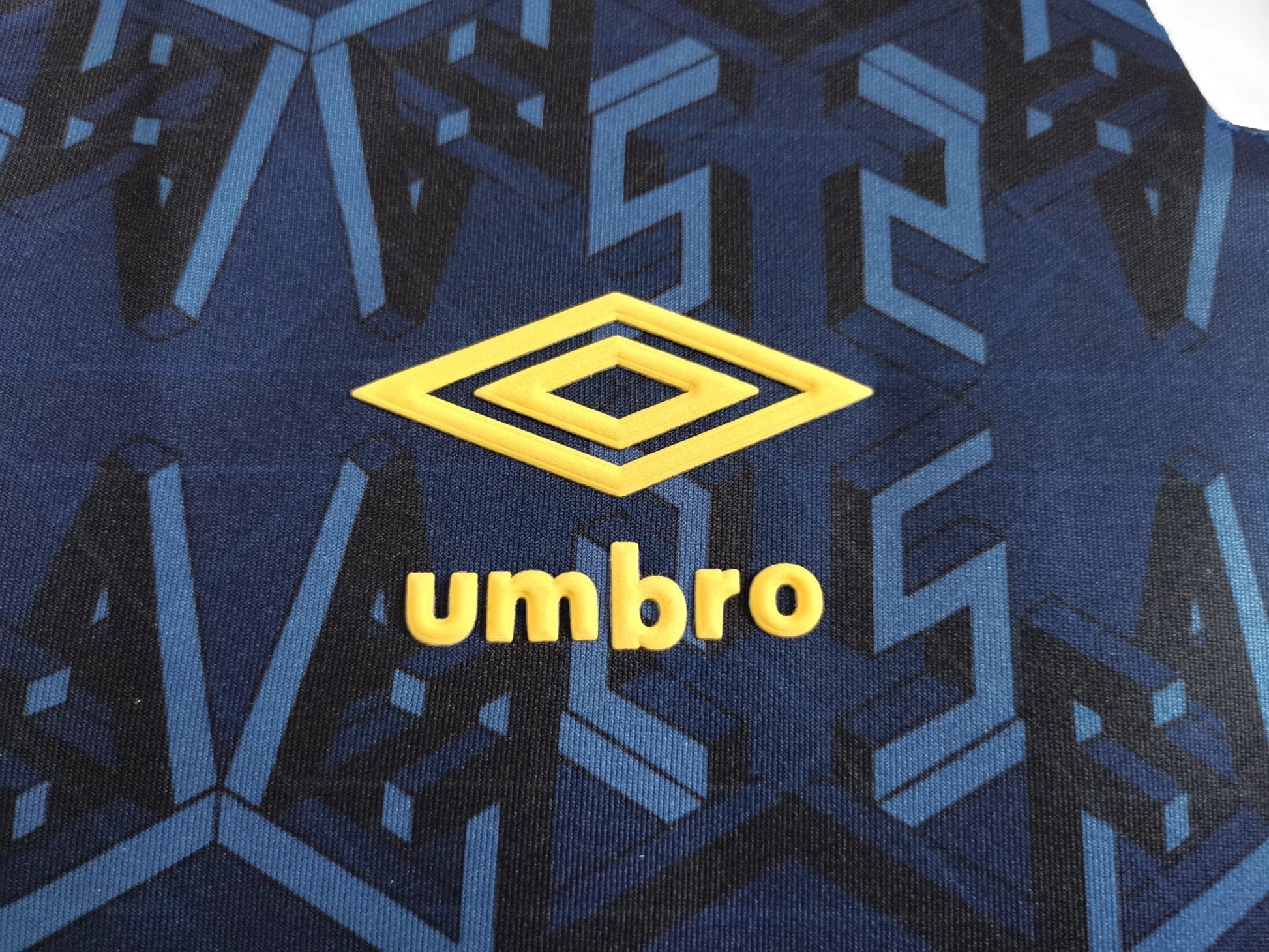 The jersey design embodies quintessential 90s retro style, featuring a deep navy blue base adorned with geometric patterns. White collar and cuff details add depth, while the pairing of the Umbro logo and team crest exudes vintage charm.