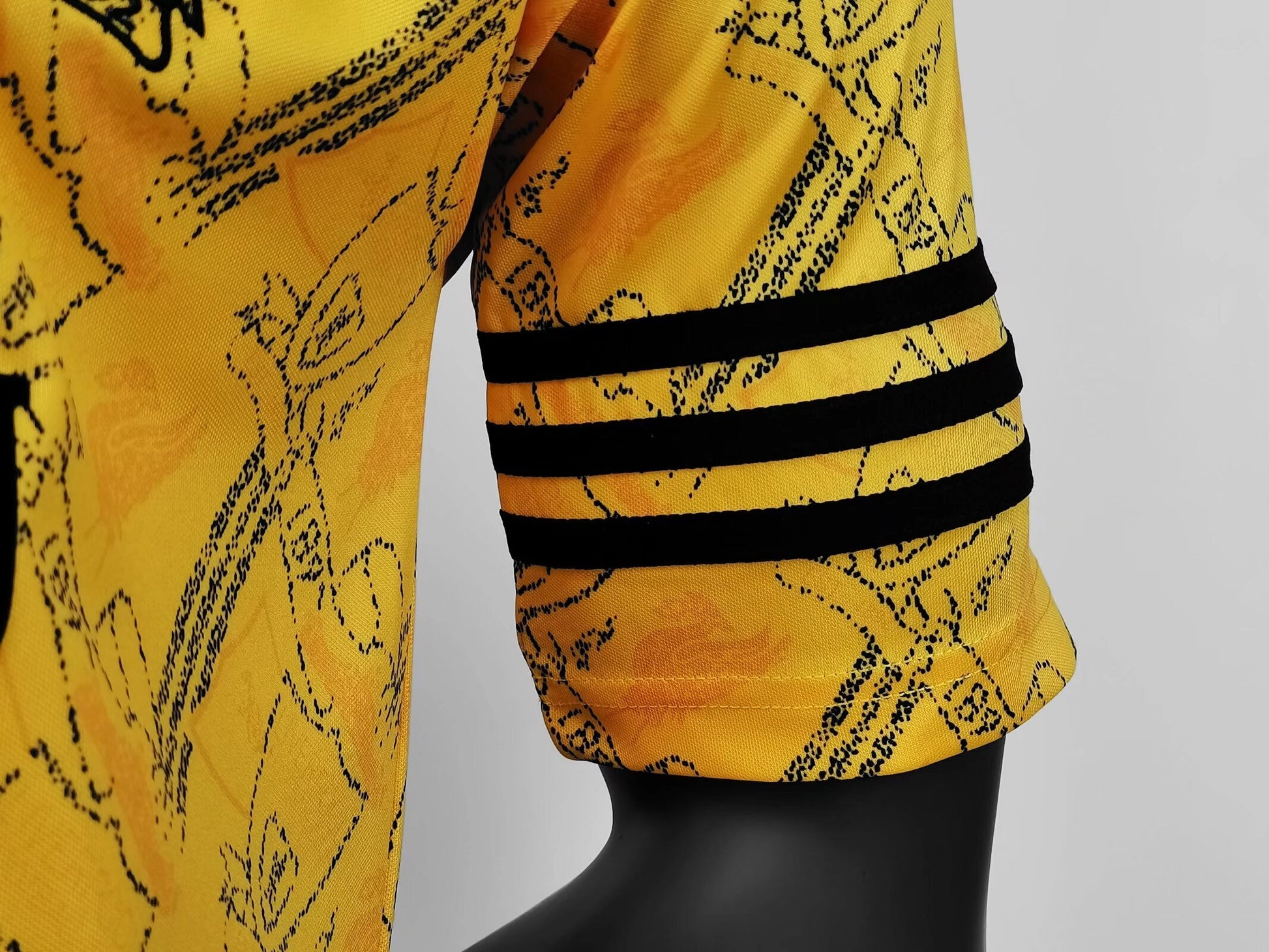 The design stands as a retro benchmark: a striking bright yellow base offers unmistakable recognition, while the iconic Adidas three-stripes on the shoulders feature a green-and-white color-blocking that captures the aesthetic of 1990s sportswear. The red-and-yellow checkered collar holds deeper meaning, drawing inspiration from the passion of the Kop stand and the checkered flag of the 1977 European Cup Final, symbolizing the bond between the club and its community. The eternal flame encircling the '96 badge on the back of the neck carries profound remembrance for the victims of the Hillsborough disaster.