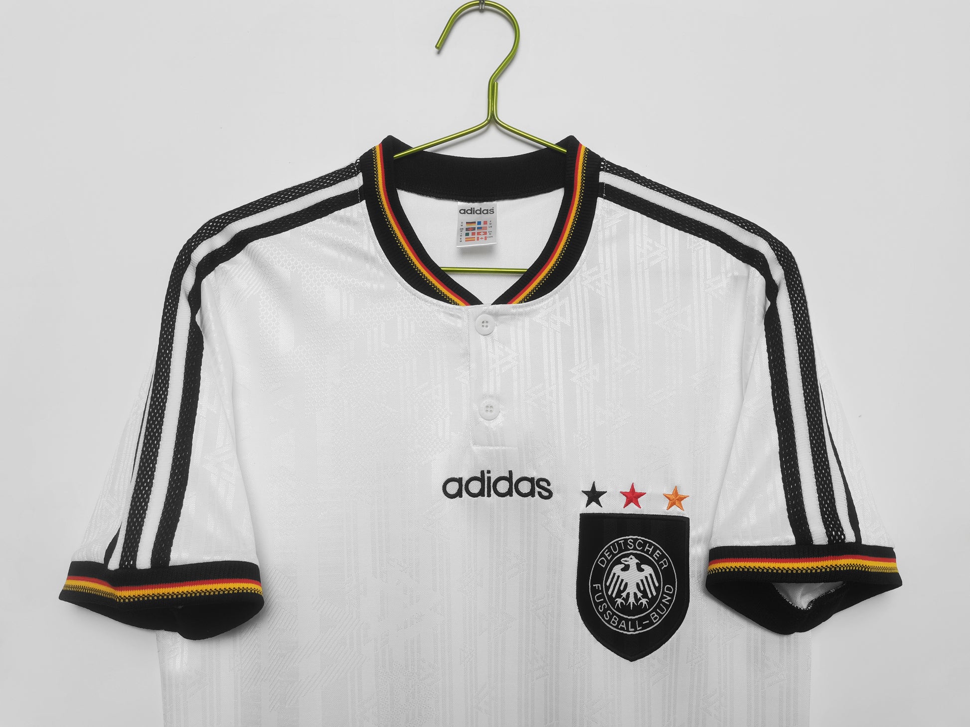 The jersey recreates the iconic 90s design: a pristine white base honors tradition, vertical red-black-yellow stripes across the chest echo the national flag, and the black-embroidered federal eagle emblem stands solemn and striking. The iconic Adidas three-stripes on the shoulders feature retro colorways. Thick polyester fabric and a relaxed fit recreate the authentic matchday feel, while flocked numbers add a touch of vintage authenticity.