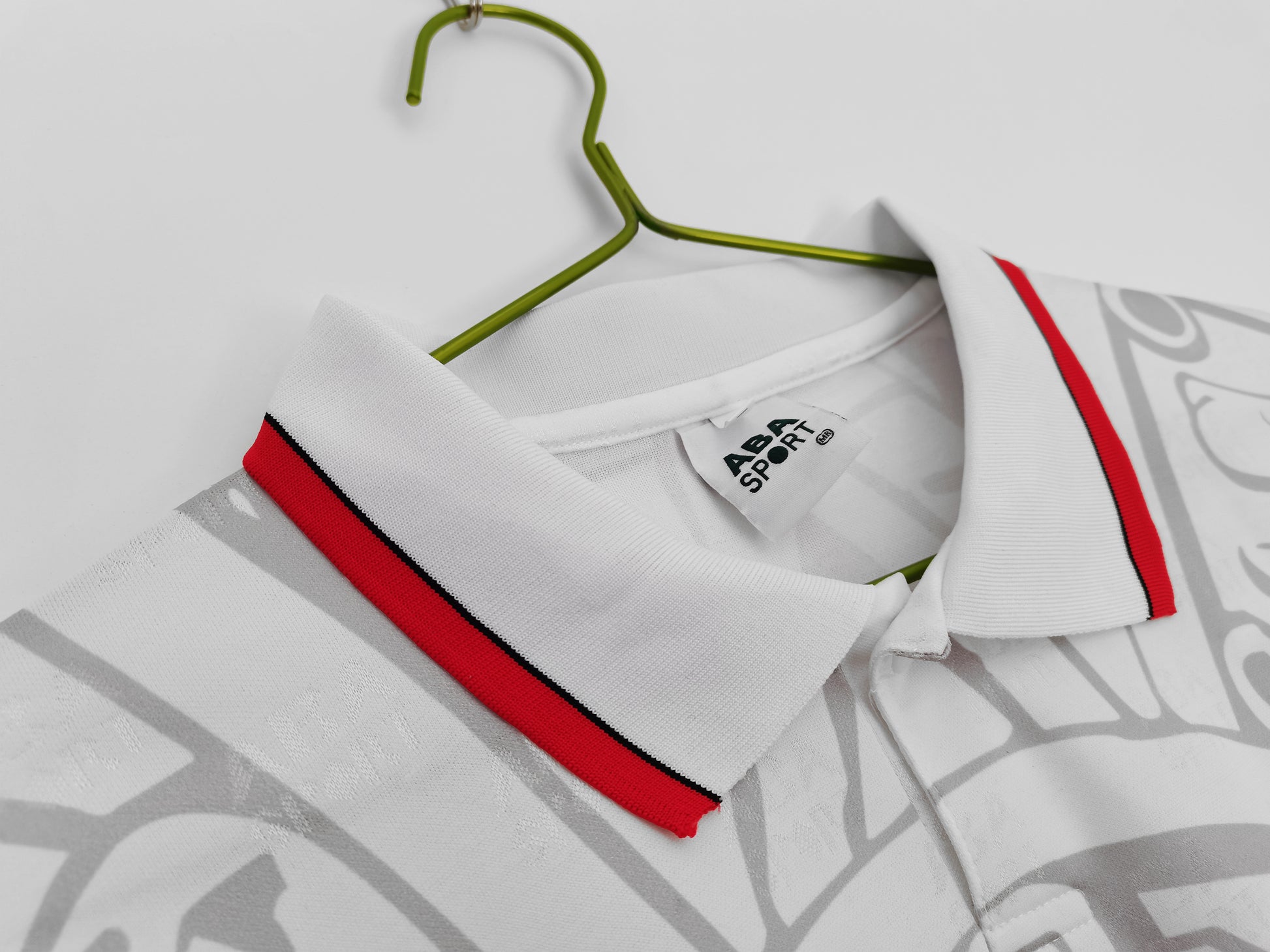 The jersey, crafted by local brand ABA Sport, features a white base adorned with Aztec calendar stones and feathered serpent motifs, etching millennia of civilization onto the fabric. The crisp, retro white polo collar with red trim, paired with the bold “MEXICO” lettering and national team crest on the chest, embodies a daring, avant-garde design—a pinnacle of 1990s football apparel culture.