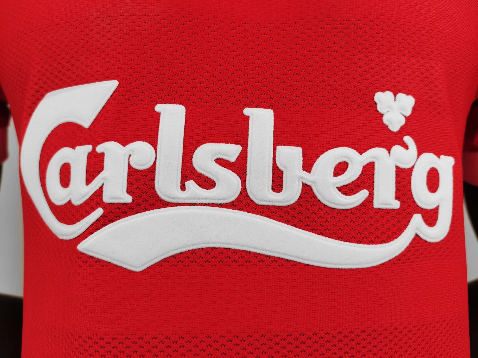 The design honors tradition while bearing the mark of its era: a pure deep red base upholds a century of heritage, with the embroidered crest featuring a flame emblem (commemorating the Hillsborough victims). The white rubber-printed Reebok Vector logo creates layered contrast with the Carlsberg insignia, showcasing quintessential 90s sportswear aesthetics. The ribbed crew neck and knit fabric blend breathability with vintage texture.