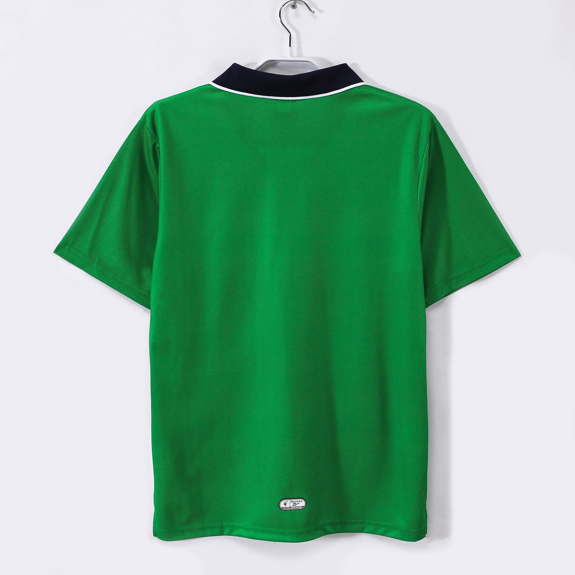 The jersey features a highly recognizable bright green base, accented with navy blue and white details. Its vibrant colors not only create a striking visual impact on away pitches but also earned it the affectionate nickname “Carlsberg Green” among fans for its resemblance to the iconic Carlsberg beer can.