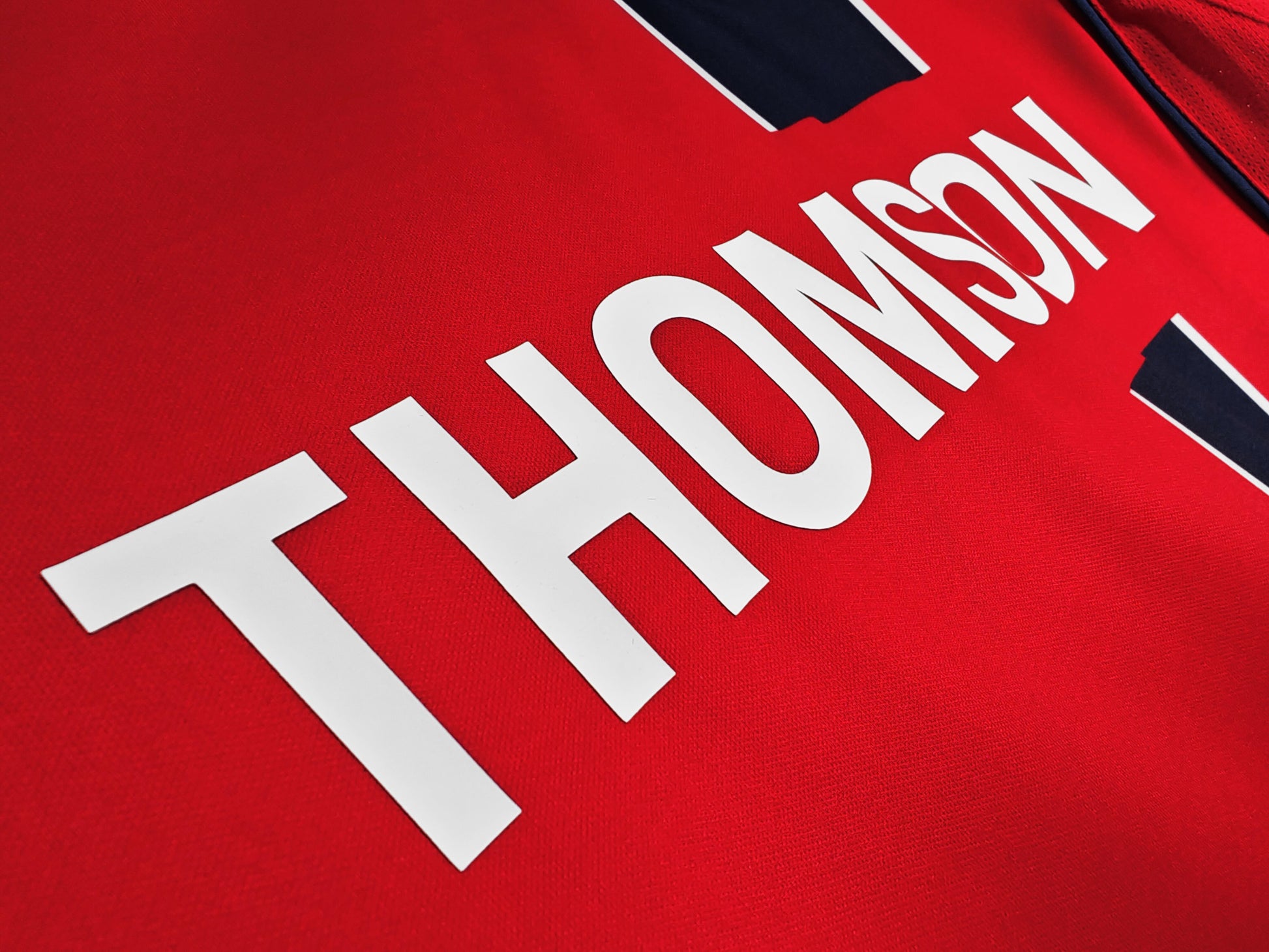 The jersey features a striking red primary color, paired with a navy blue base and white trim. Its signature red vertical stripes on the sides offer unmistakable recognition.