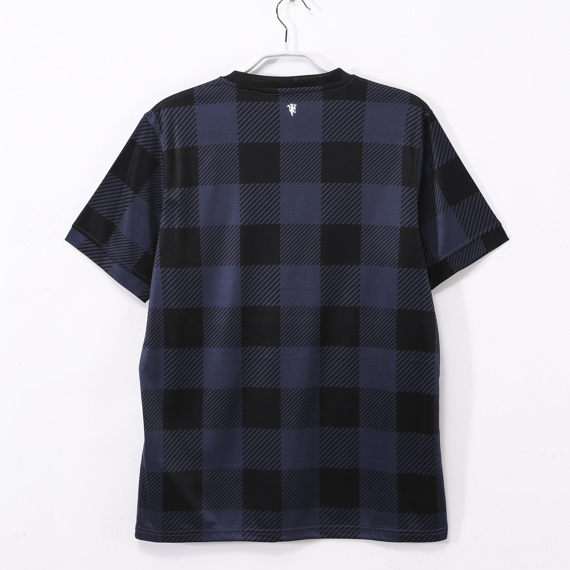 This iteration features a navy and black checkered pattern with monochrome club crest and branding, emphasizing understated sophistication.